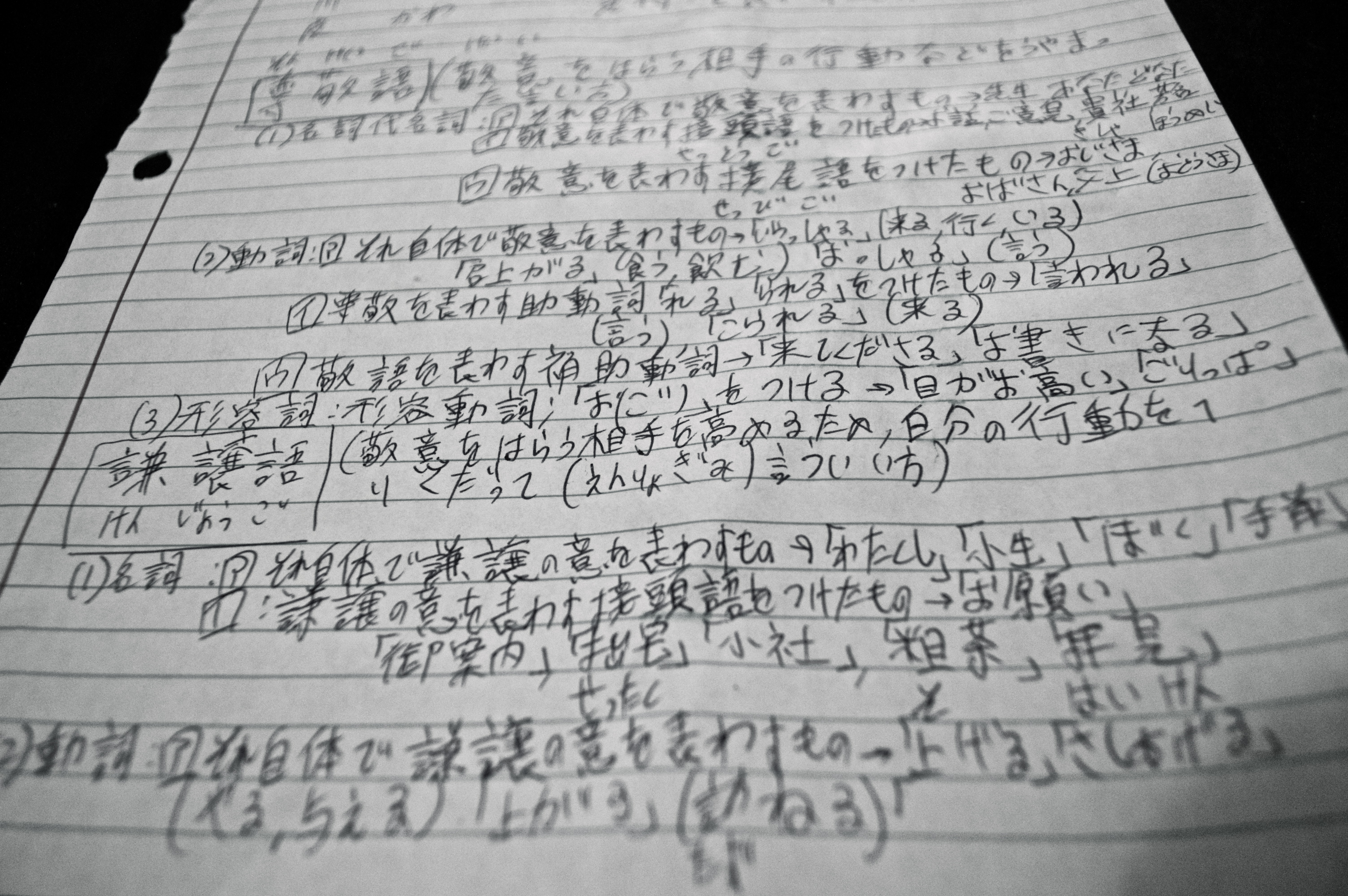 And now I find myself going over to Sato san’s for Japanese classes. An educator for most of his life and a Japanese teacher now, he sets up an easel and a board, which he taps with a pointer made of connected pencils, lecturing me on sonkeigo and kenjyougo. We eat momo and banana and drink green tea and talk about Jerry’s indulgences.